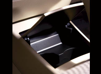 The convenient front-seat cup holder’s lid opens smoothly at the touch of a finger.